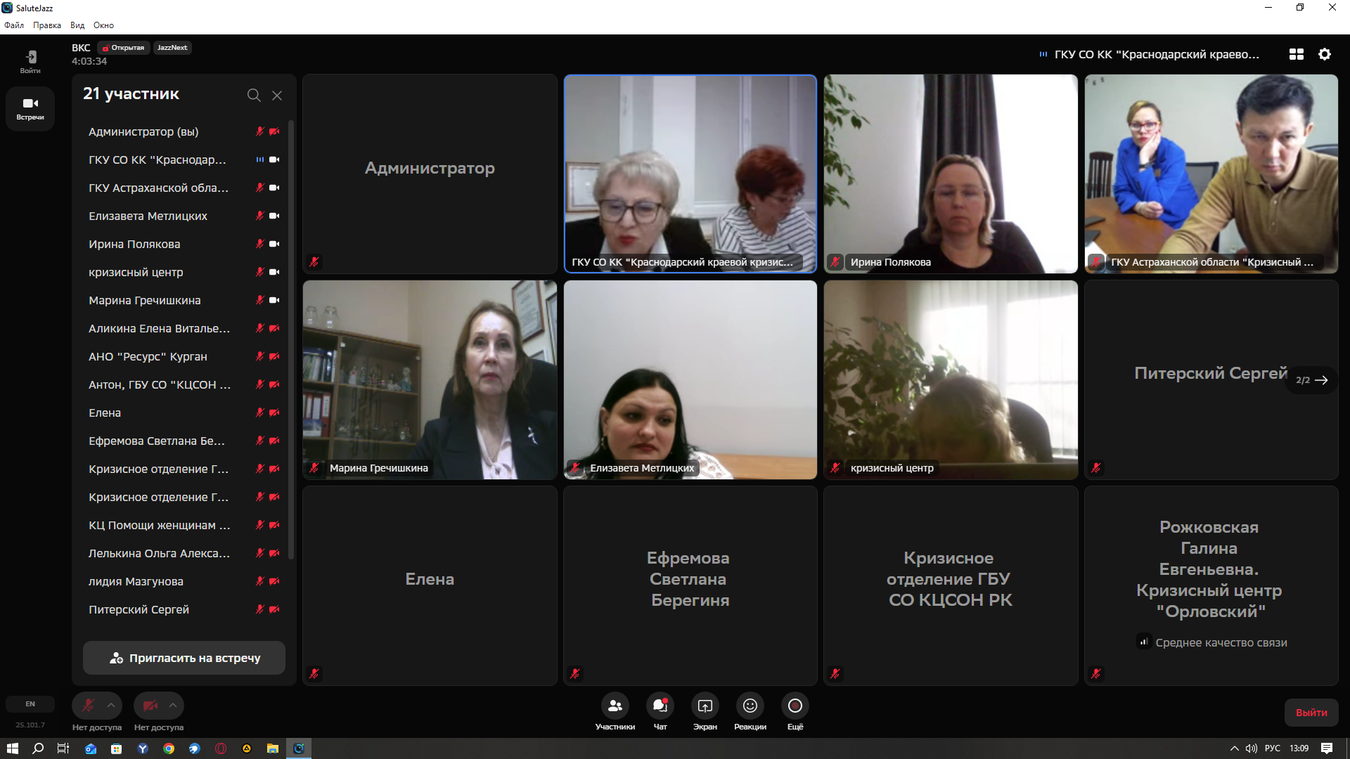 В Международный день борьбы за ликвидацию насилия в отношении женщин в учреждении состоялось всероссийское онлайн мероприятие, в котором приняли участие представители организаций помощи женщинам из 24-х регионов Российской Федерации.25 ноября 2025 года в Международный день борьбы за ликвидацию насилия в отношении женщин в государственном казенном учреждении социального обслуживания Краснодарского края «Краснодарский краевой кризисный центр помощи женщинам и мужчинам, в том числе с детьми» состоялось всероссийское онлайн мероприятие, в котором приняли участие представители организаций помощи женщинам из 24-х регионов Российской Федерации. Гостями мероприятия стали первый заместитель председателя Комитета Государственной Думы по защите семьи, вопросам отцовства, материнства и детства Татьяна Викторовна Буцкая и заместитель начальника отдела организации деятельности учреждений для несовершеннолетних министерства труда и социального развития Краснодарского края Сергей Геннадьевич Питерский. В этом году темой видеоконференции стала: «Разработка и внедрение новых технологий для оказания помощи женщинам, в том числе беременным и с детьми, находящимся в кризисной ситуации».
