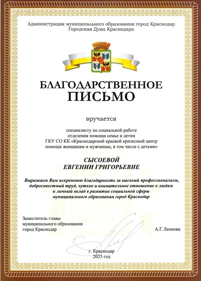 Сысоева Благодарность АМО Краснодар